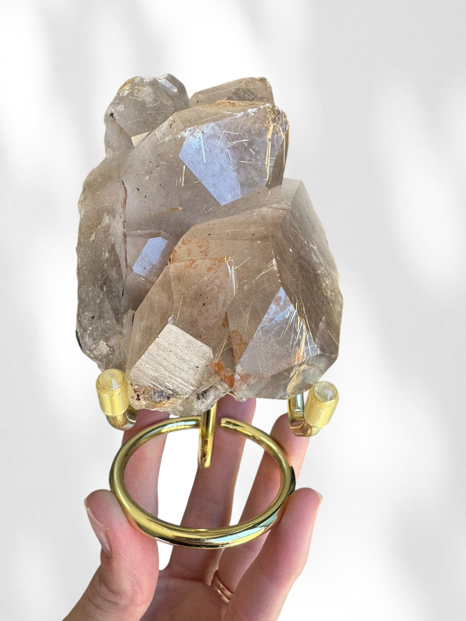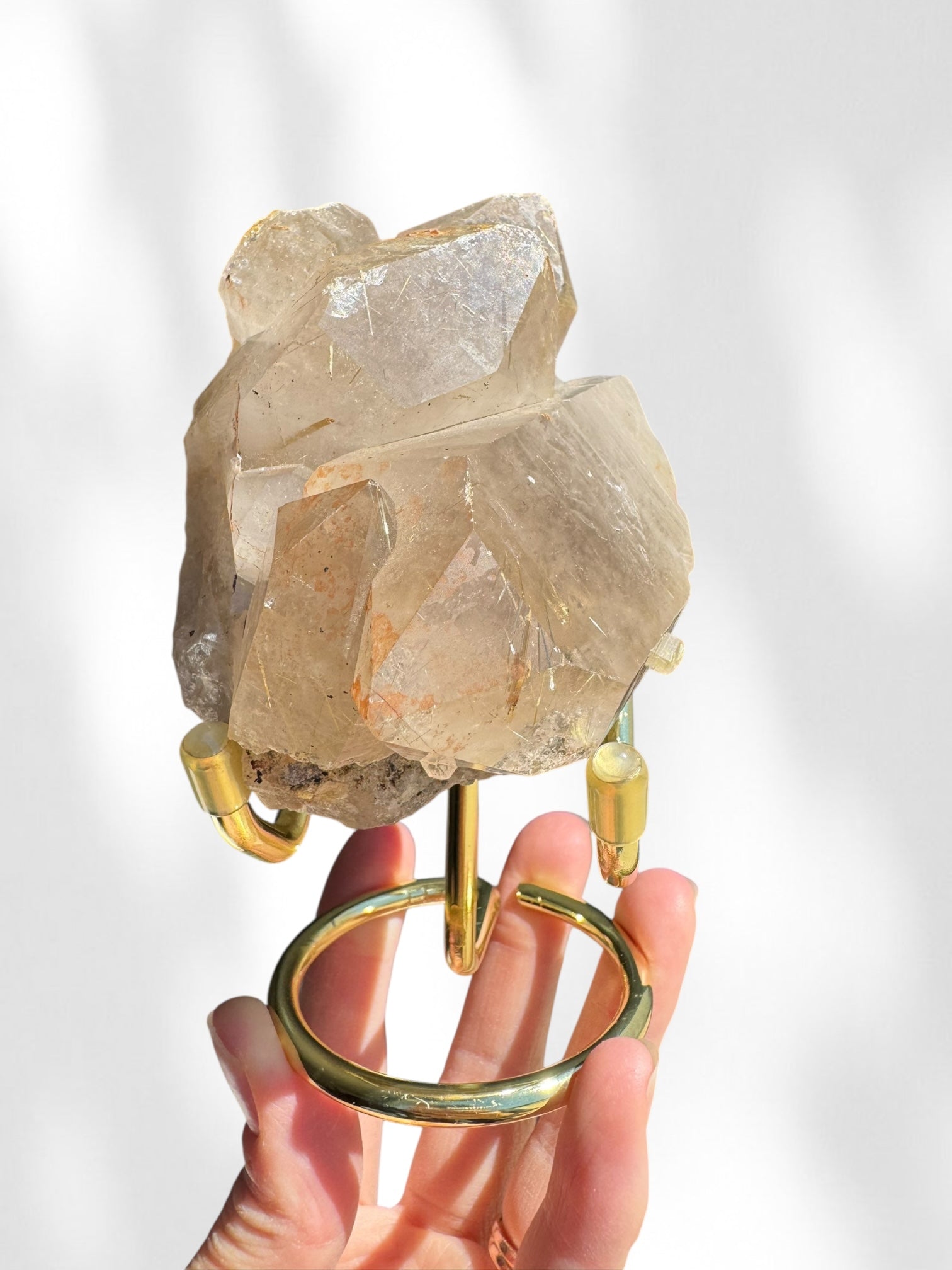Golden rutile is predominantly made up of silicon dioxide (quartz) with titanium dioxide (rutile) inclusions that look like golden needles, hence the name 'golden rutile' or 'rutilated quartz'. The formation of these crystals usually occur through hydrothermal processes in igenous rocks called pegmatites, where very hot, mineral-rich fluids flow through the cavities in the rocks and deposit the minerals. It is here where the liquid cools and forms quartz and rutile crystals that interlock during their formation, creating the spectacular pattern exhibited by golden rutile crystals.