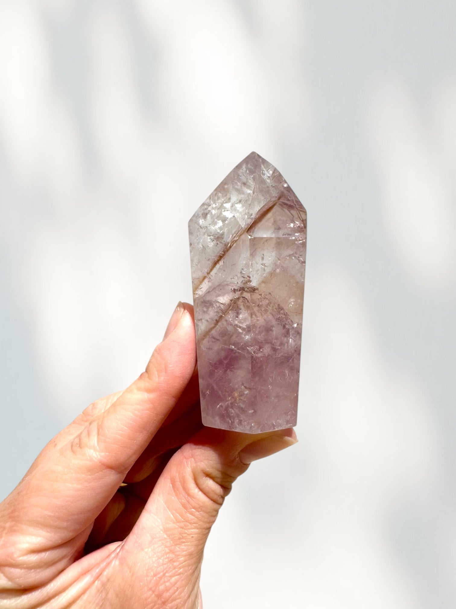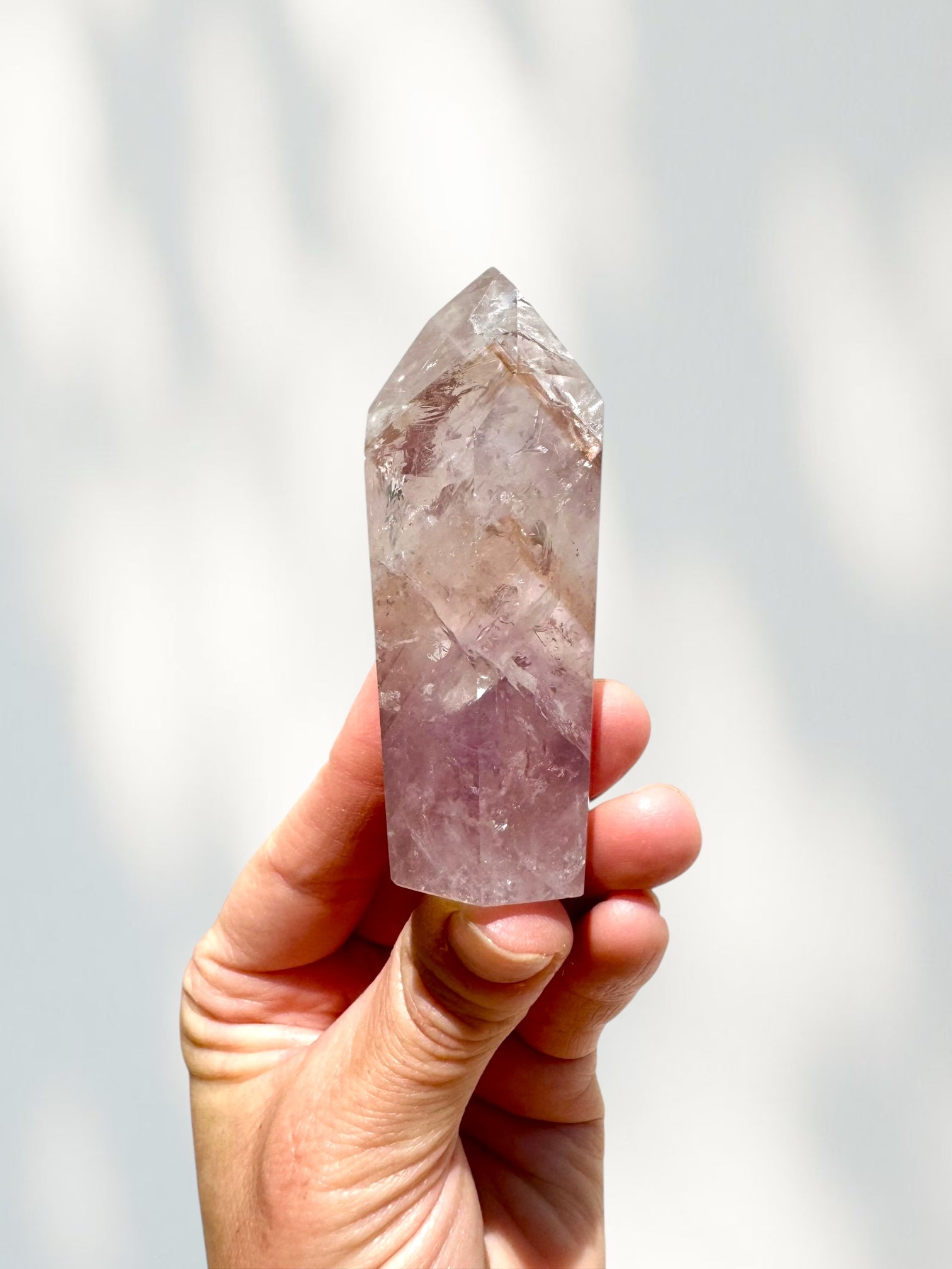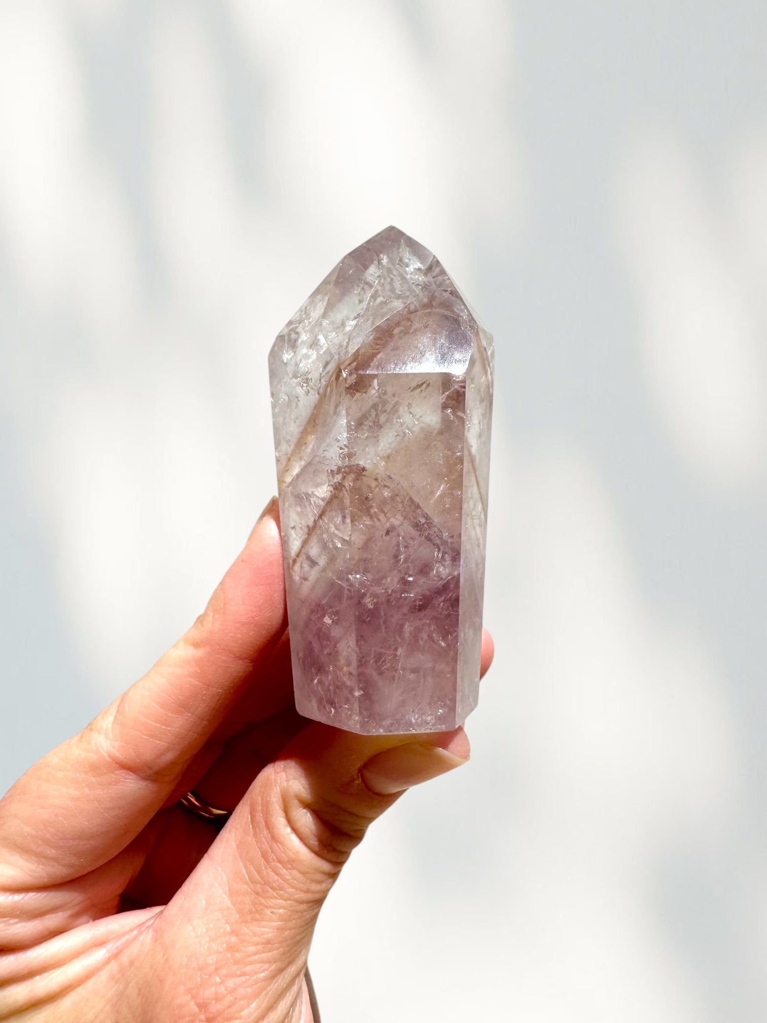 Phantom amethyst forms when quartz crystals undergo episodic growth. Firstly, a crystal begins, then growth halts, then new quartz grows around the previous crystal, creating the “phantom” ghost image of the earlier stage. The result is an internal phantom outlines within the main crystal.